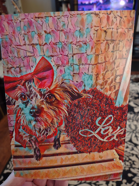 5x7 Valentine Card. Card showcases Galaga in a cute bow with a heart that says Love. This is a Glossy Card. You get card, white envelope and a seal/sticker.
