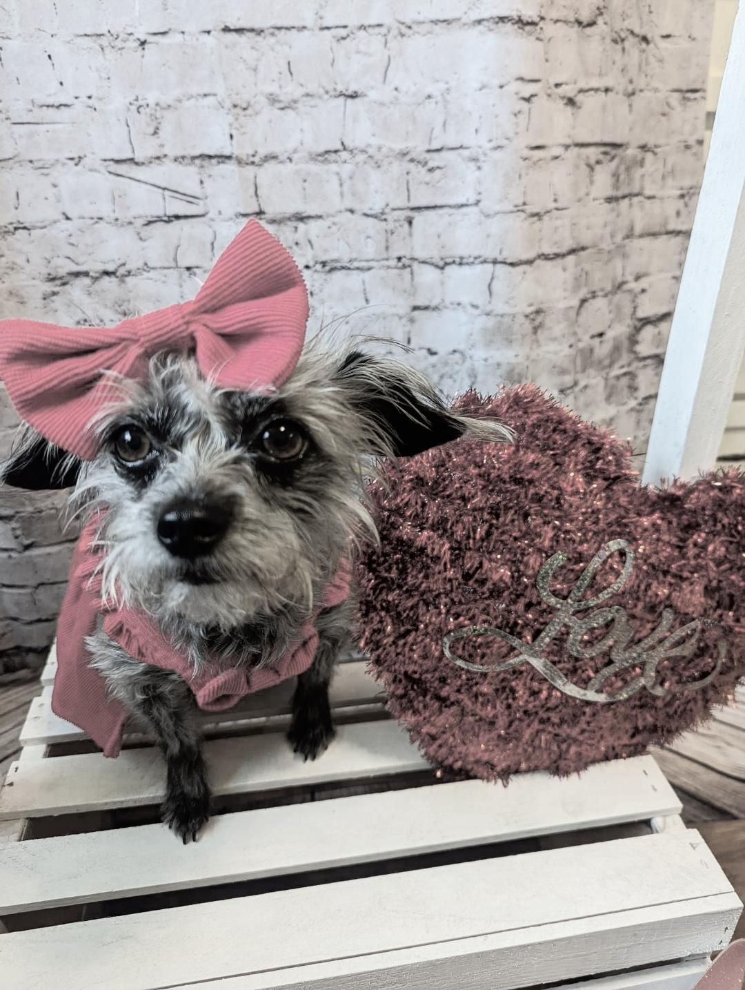 5x7 Valentine Card. Card showcases Galaga in a cute bow with a heart that says Love. It's a Black and white card with a bit of added color for the dress, bow and heart. This is a Glossy Card. You get card, white envelope and a seal/sticker.