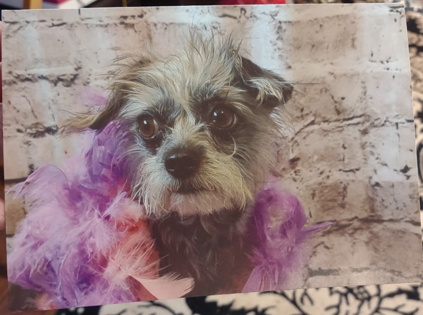 5x7 card on Glossy cardstock. Galaga sits in front of a wall with pink and purple feather boa's. Perfect for any occasion, Birthday, Just Because, a Pick Me Up and so much more. You get card, white envelope and a seal/sticker.
